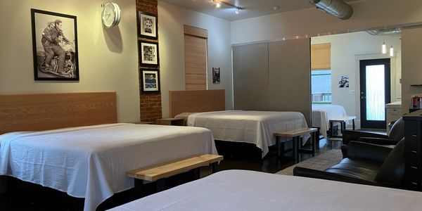 Lodging with two king sized beds with a full bath.